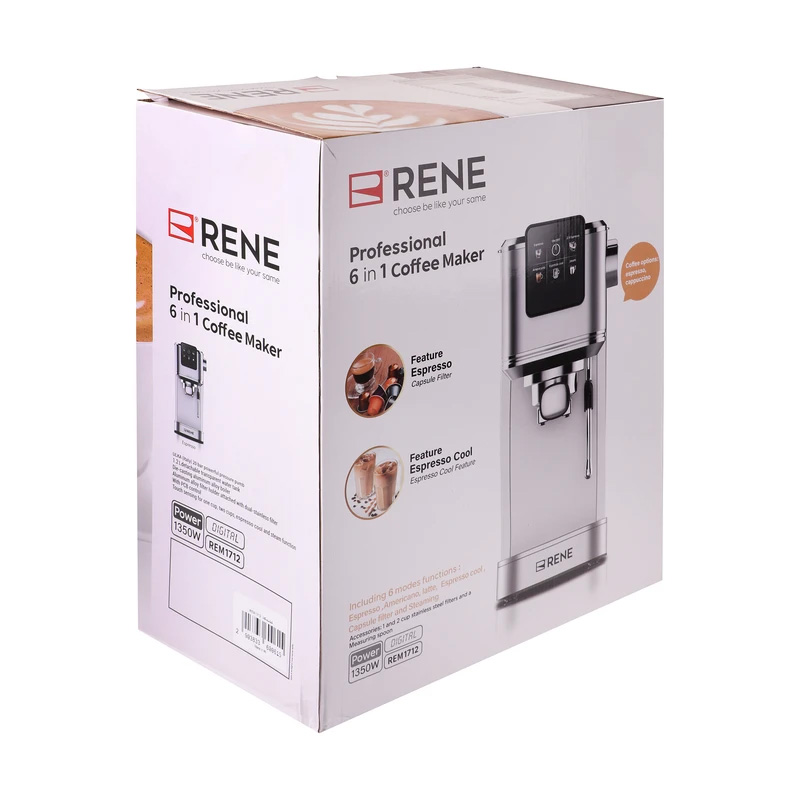 با طراحی جمع‌وجور و امکانات حرفه‌ای، اسپرسوساز رنه REM‑1712 تجربه‌ی تهیه‌ی قهوه‌ای باریت و باکیفیت بالا در خانه را فراهم می‌کند. داشتن پمپ ۲۰ بار ایتالیایی و توان مصرفی ۱۳۵۰ وات، عصاره‌گیری سریع و کرمای غنی را ممکن می‌سازد. صفحه کنترل لمسی لمسی کاربری ساده و دقیق را ایجاد می‌کند.